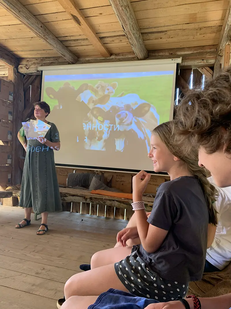 Кроме того на территории фермы есть костровая площадка, уличные зоны для творчества, волейбольное поле, кольцо для стритбола, футбольное поле, лесная полоса препятствий, домик травника и даже семейный музей аутентичных предметов быта и старины. На ферме разводят держат куриц, коров и овец. Корову мы обязательно подоим, а курицы будут приносить нам свежие яйца к завтраку!